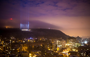 Cérémonie en 2014 soulignant le 25e anniversaire de la fusillade : quatorze faisceaux de lumière représentant les quatorze victimes illuminent le ciel à partir du mont Royal.