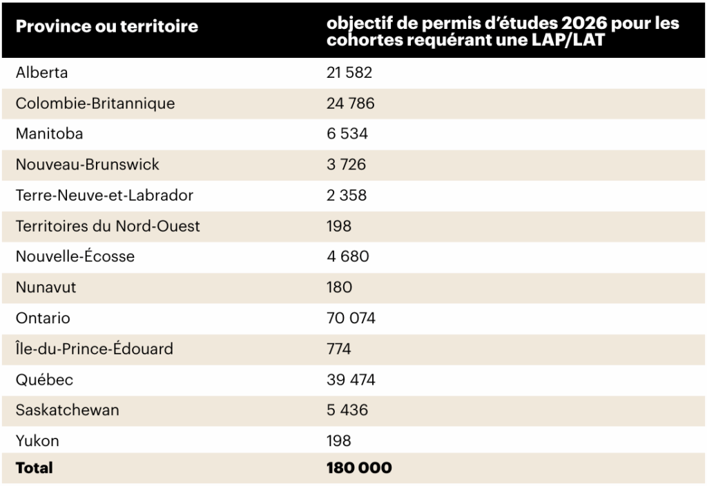 Le nombre de permis d’études délivrés en 2026 nécessitant une lettre d’attestation provinciale ou territoriale (LAP/LAT) s’élèvera à 180 000, qui sera est réparti entre les provinces et les territoires en fonction de leur population respective. Voici les attributions provinciales et territoriales pour 2026 :